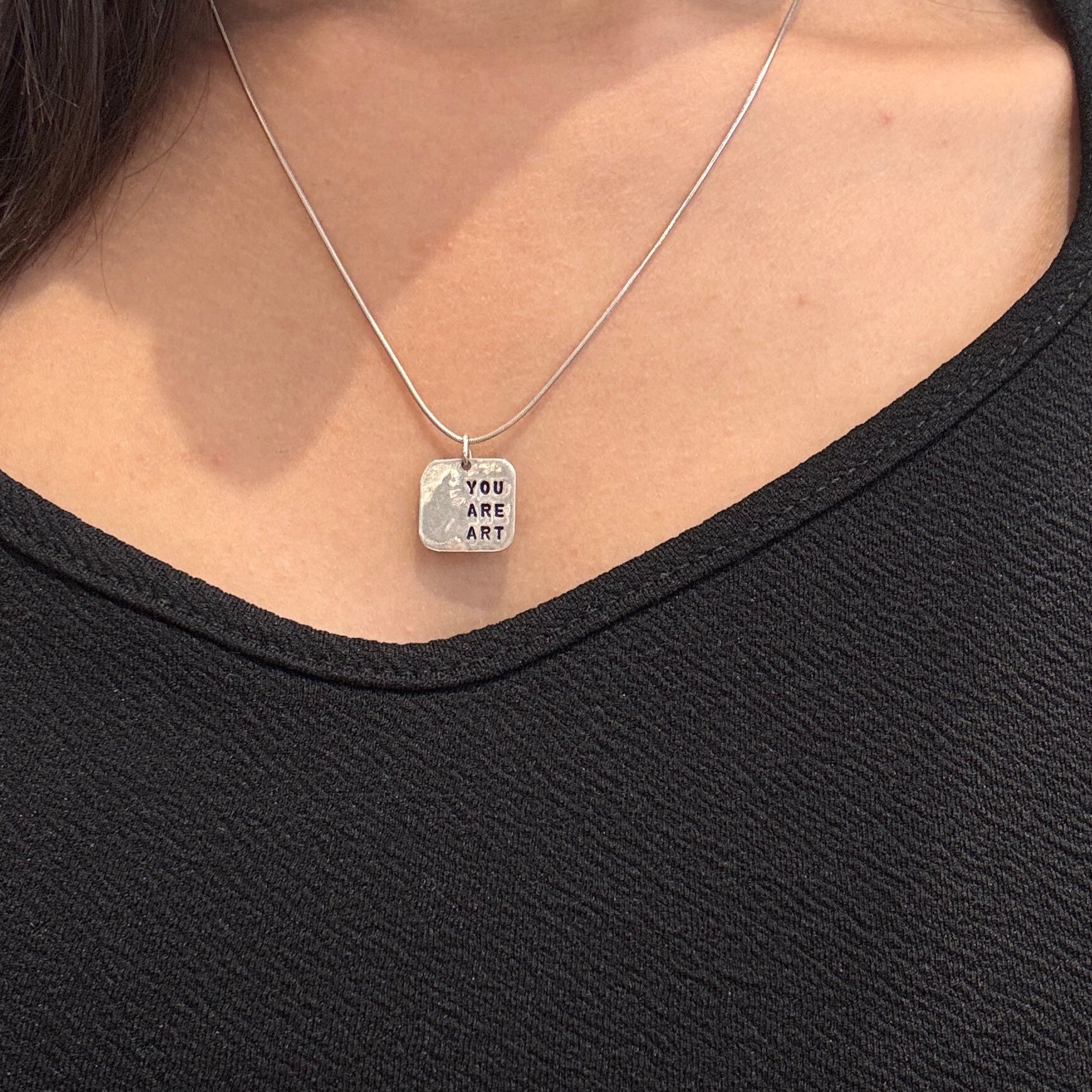 Wear your expression with this you are art necklace in 925 silver—a lightweight piece that adds a touch of elegance to your everyday style. At just (approximately) 4.5 g, it’s perfect for daily wear, reminding you that, like this necklace, you too are a unique piece of art. The pendant's (approximately) 14x14 mm size and (approximately)1 mm thickness make it subtle yet striking, while the 18-inch chain sits gracefully around your neck. you are art is a unisex necklace, suitable for anyone.